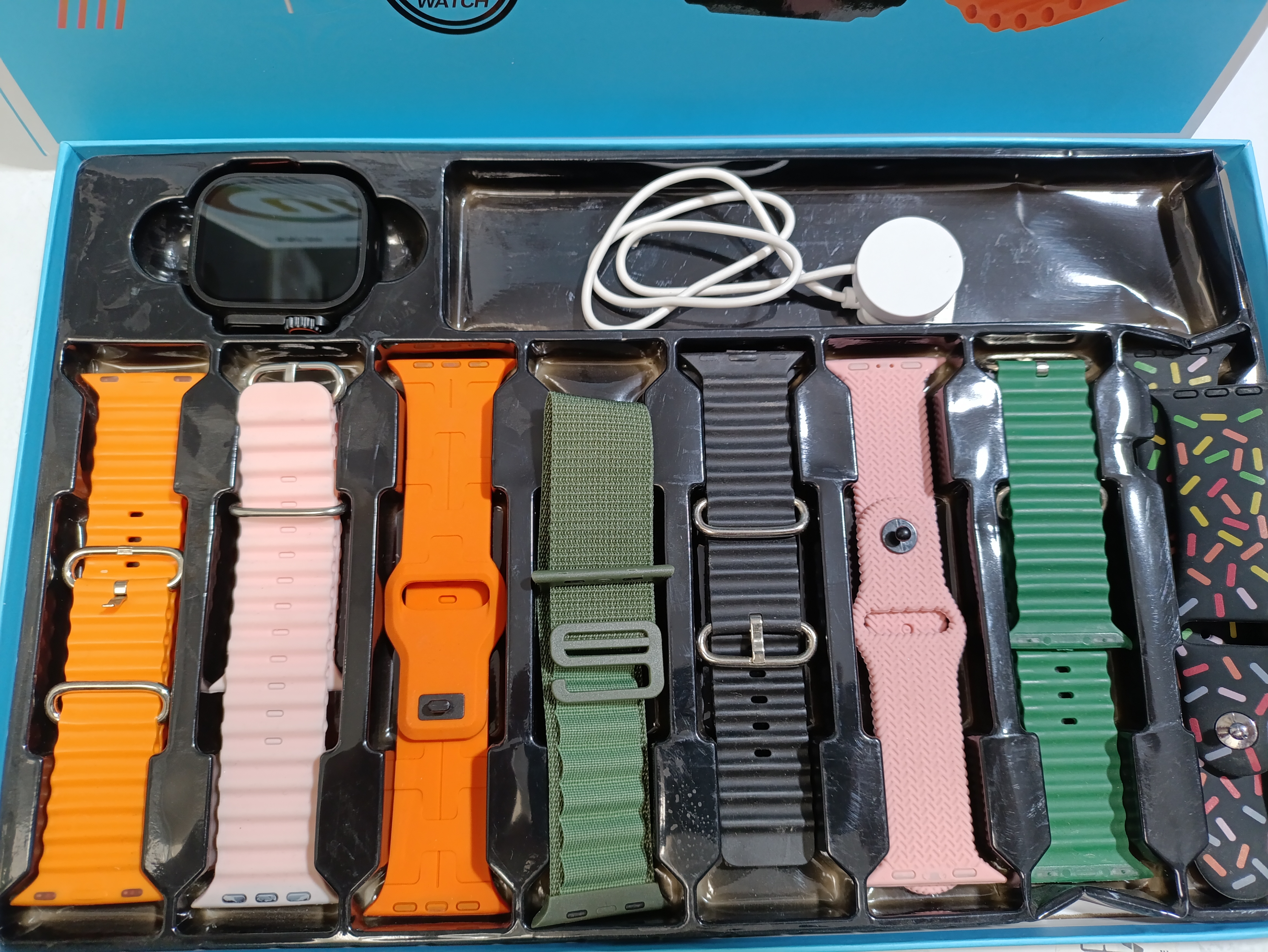 دارای 5بند 4بند سیلیکونی و یک بند فلزی و یک ساعت اضافی